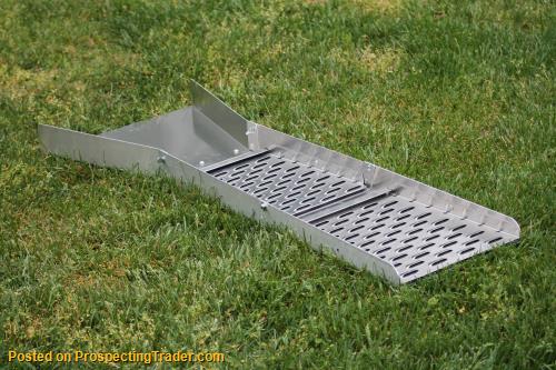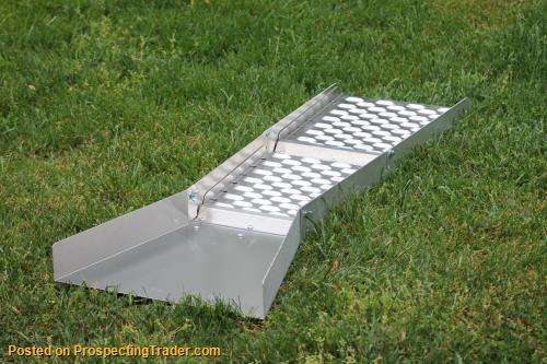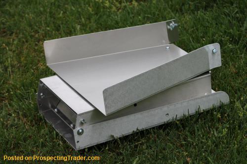 Brawn Backpackable Folding Sluice Boxes processes more gold in less time than conventional hungarian riffle sluice boxes. This over under design means you don't have to classify your material. Each uses two gold-catching louvered decks. This allows you to clean out the upper section seperately, as most of your recover will be in the first section of the sluice. Less down time equals more gold! Water-pressure-drop technology allows precious metals to fall into the twin riffles, where they can be easily recovered on the ribbed gold catching carpet.. Twin nugget traps catch more gold, resulting in excellent gold recovery of coarse gold. Lightweight marine-grade-aluminum design enables you to transport your equipment more efficiently and set up anywhere your adventures take you. Three-way fold. Packs easily into a backpack. Made in USA.