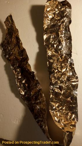 gold ~3 mils on foil, 4 inches x 36 - 40 inches , weight 4+ grams, one side shiny gold, other side dull gold, some small unplated spots, many available