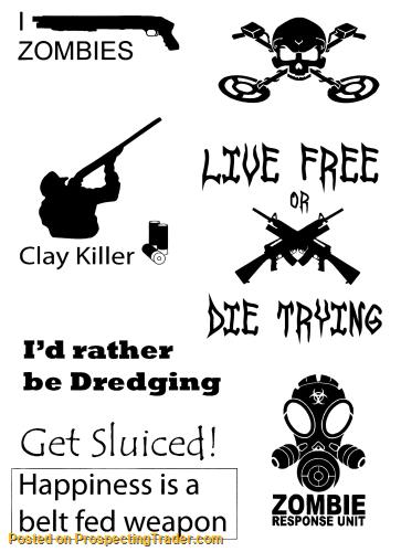 Different vinyl graphics relating to gold mining and a few firearms related. I currently have what is shown printed on white. For sizes and prices please contact me. I can also do any custom logos, slogans, or pictures you would like.